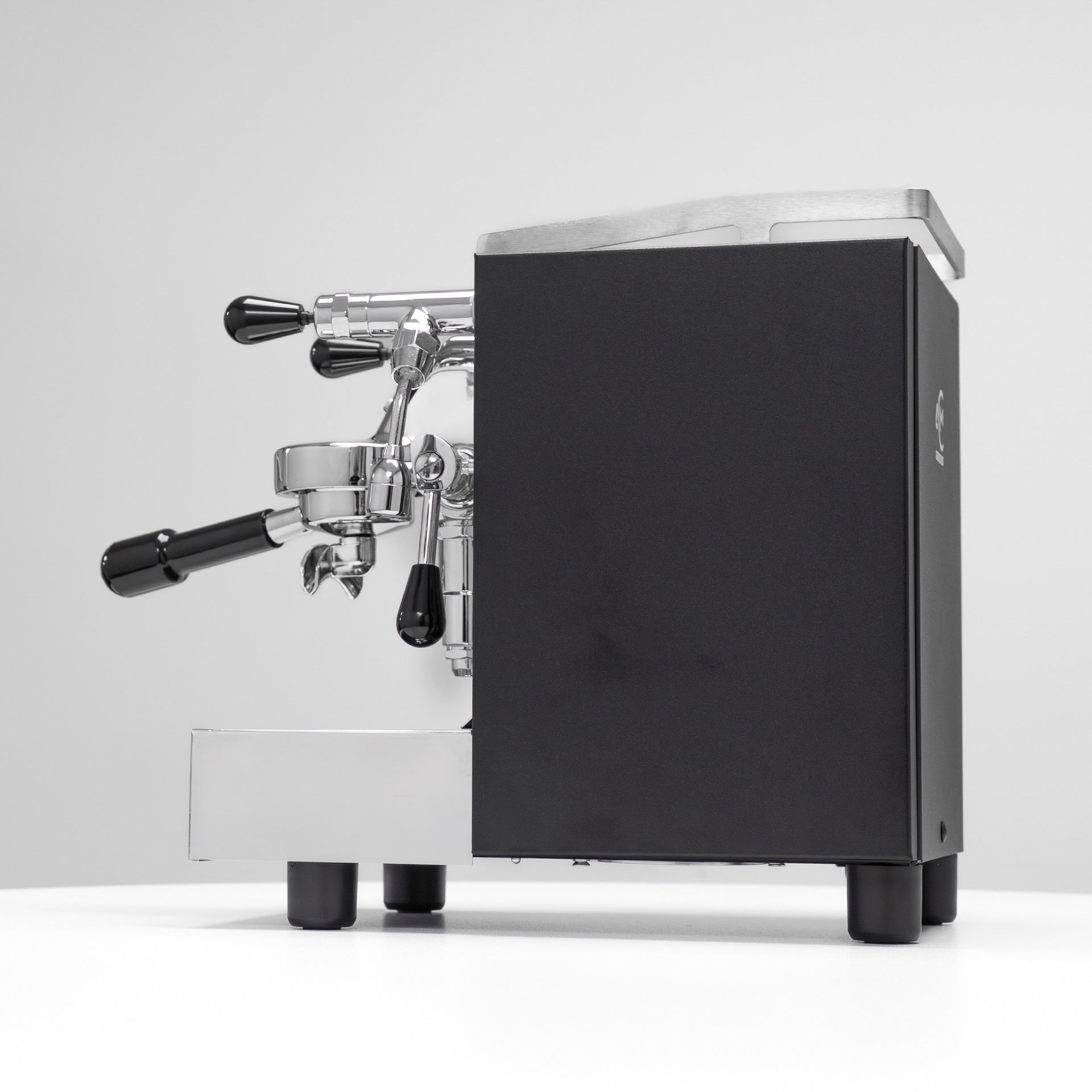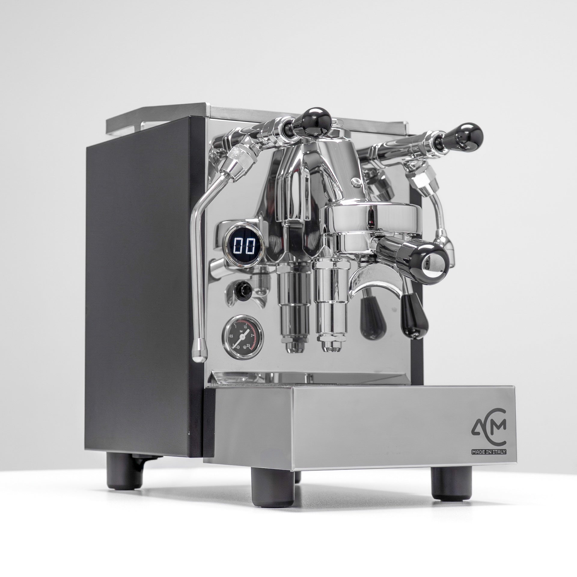 The ACM Homey is the ultimate compact home coffee machine. Made in Italy, it comes complete with digital shot timer, dual steam and hot water levers, a stainless steel boiler with a chrome and matte charcoal finish.